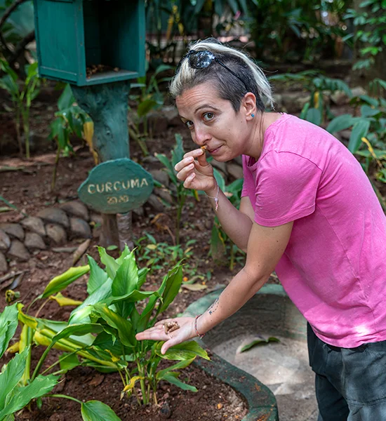 Il giardino è un tripudio di piante. Per ognuna, l’esperto accompagnatore chiede di riconoscere o tirare ad indovinare la specie. Se si hanno difficoltà, come nel nostro caso, non essendo esperti botanici, il simpatico Tyronne dà degli aiutini facendo riflettere e ragionare osservando, e spesso, anche annusando, fiori, foglie, frutti e bacche.