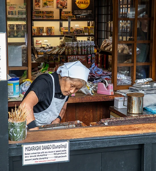 Avendo un po’ di tempo a disposizione, abbiamo poi esplorato la Takayama “della vita di tutti i giorni”, andando alla scoperta dei mercatini mattutini: il Mercato di Jinya-mae che si trova nella piazzetta antistante il Takayama-jinya e il Mercato di Miya-gawa, più grande e sviluppato lungo la riva orientale del Miya-gawa.