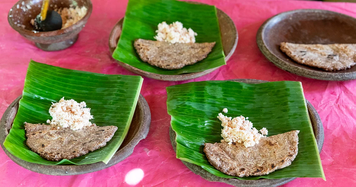 Ingredienti base alla mano, ci spostiamo nella vera e propria cucina: una lastra di pietra dove farina di miglio, cocco grattugiato, acqua e latte di cocco vengono lavorati. Con l’impasto ottenuto si formano delle mini piadine chiamate Roti, una specie di tortilla che somiglia al roti indiano (ma meno grasso) e al chapati africano.