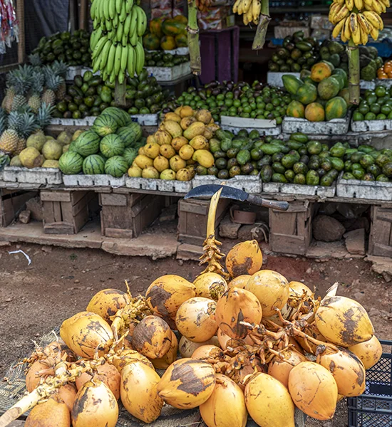 La pulitura del riso, che avviene ancora rigorosamente a mano, mediante un grande mortaio; la macinatura dei chicchi di miglio per ottenere la farina con una macina, inutile dirlo, manuale; la lavorazione del cocco per ottenere il latte.