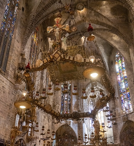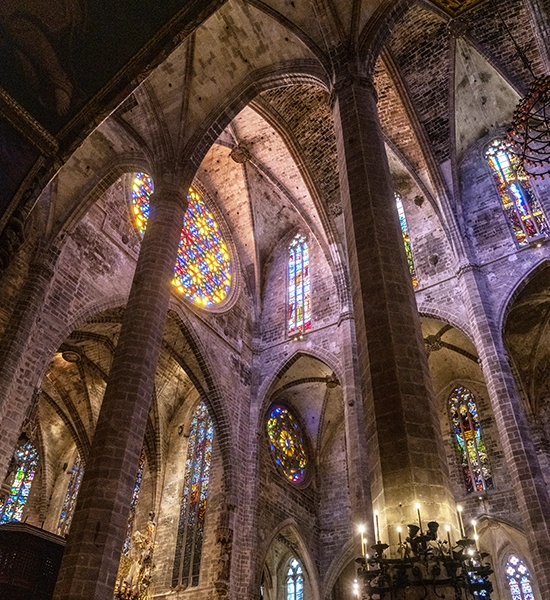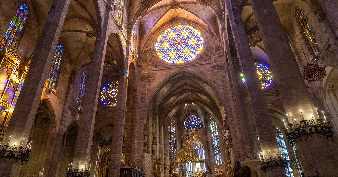 Oltre al rosone, ci sono 61 vetrate colorate da cui filtra la luce del sole, inondando gli interni con spettacolari fasci di luce. Proprio per questo, la Cattedrale di Palma di Maiorca è soprannominata la “Cattedrale della Luce”.