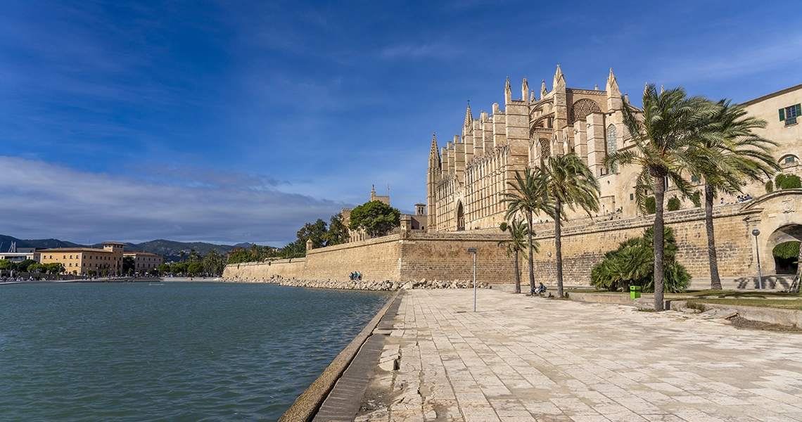 La Cattedrale di Palma di Maiorca si trova praticamente sul mare. In posizione sopraelevata, la sua sagoma inconfondibile si scorge mentre si passeggia lungo il Paseo Maritimo.