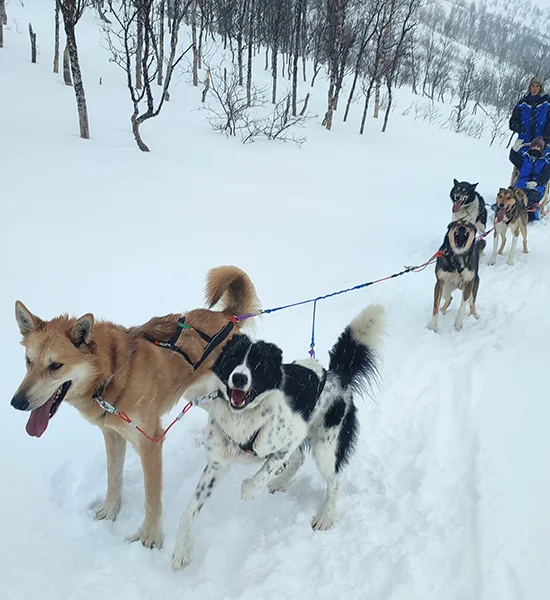 Non appena arriverete in allevamento, subito sentirete i cani festosi e scalpitanti darvi il benvenuto con il loro abbaiare. Questi cani sono incroci tra lupi e husky. Nell’allevamento sono ovviamente tenuti legati a lunghe catene che gli permettono un minimo di movimento, ma non appena sentono i turisti in arrivo, abbaiano e saltano festosi perché sanno che a breve li aspetta un folle corsa in mezzo alla neve della foresta del nord della Norvegia.
