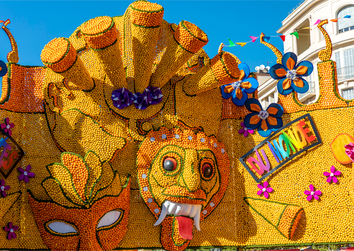 A febbraio, durante il periodo del Carnevale, Il limone è protagonista di una festa che dura circa 2 settimane durante le quali si susseguono tantissimi eventi, dalle scenografiche sfilate di carri completamente decorati con arance e limoni, all’esposizione di stupefacenti sculture giganti, tutte giallo e arancio, costruite totalmente con tali frutti. Un evento divenuto così famoso che, ogni anno, attira migliaia di turisti e visitatori.