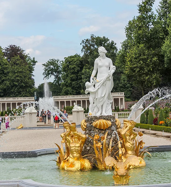 Il contesto bucolico e tenuto straordinariamente bene è allietato dai giochi d’acqua delle fontane zampillanti e dalle sculture di divinità della mitologia greca.