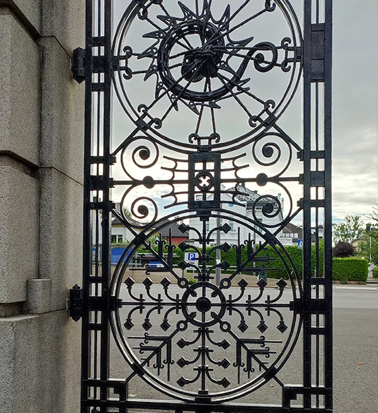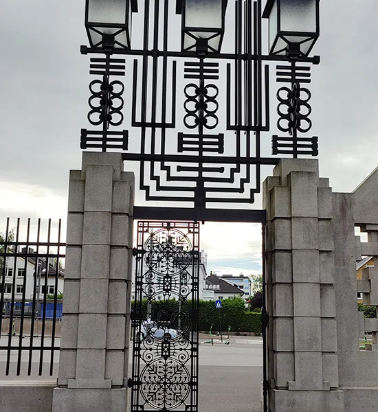 L’ingresso principale, realizzato in granito e ferro battuto, segna l’inizio del lungo percorso rettilineo che attraversa il parco stesso. È costituito da 5 grandi porte e 2 più piccole, tutte in ferro battuto. Il motivo tematico principale è quello dei draghi, uno dei motivi più ricorrenti nella produzione artistica dell’artista.