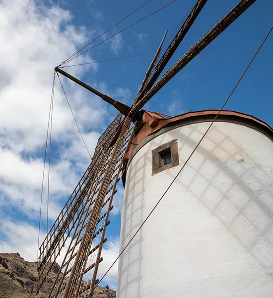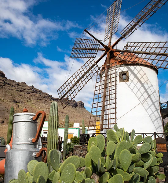 Da Mogan, andando verso l’entroterra dell’isola, ci siamo imbattuti, per puro caso, in un caratteristico mulino a vento perfettamente ricostruito e molto ben tenuto, circondato da cactus e da oggetti in proporzioni giganti (un tavolo con sedie, un macinino per caffè, una caffettiera etc…)